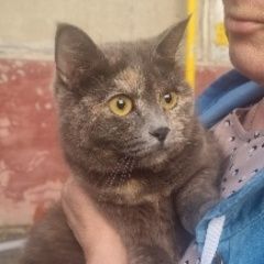 Кошка найдена серая с жёлтыми глазами под крыльцом подъезда.