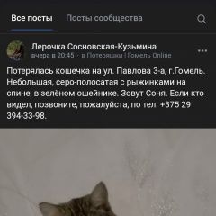 Потерялась кошечка на ул. Павлова 3-а, г. Гомель. Небольшая, гладкошерстная, серо-полосатая с рыжинками на спине, в зелёном ошейнике. Зовут Соня. Может быть в подвале. Если кто видел, позвоните, пожалуйста, по тел..