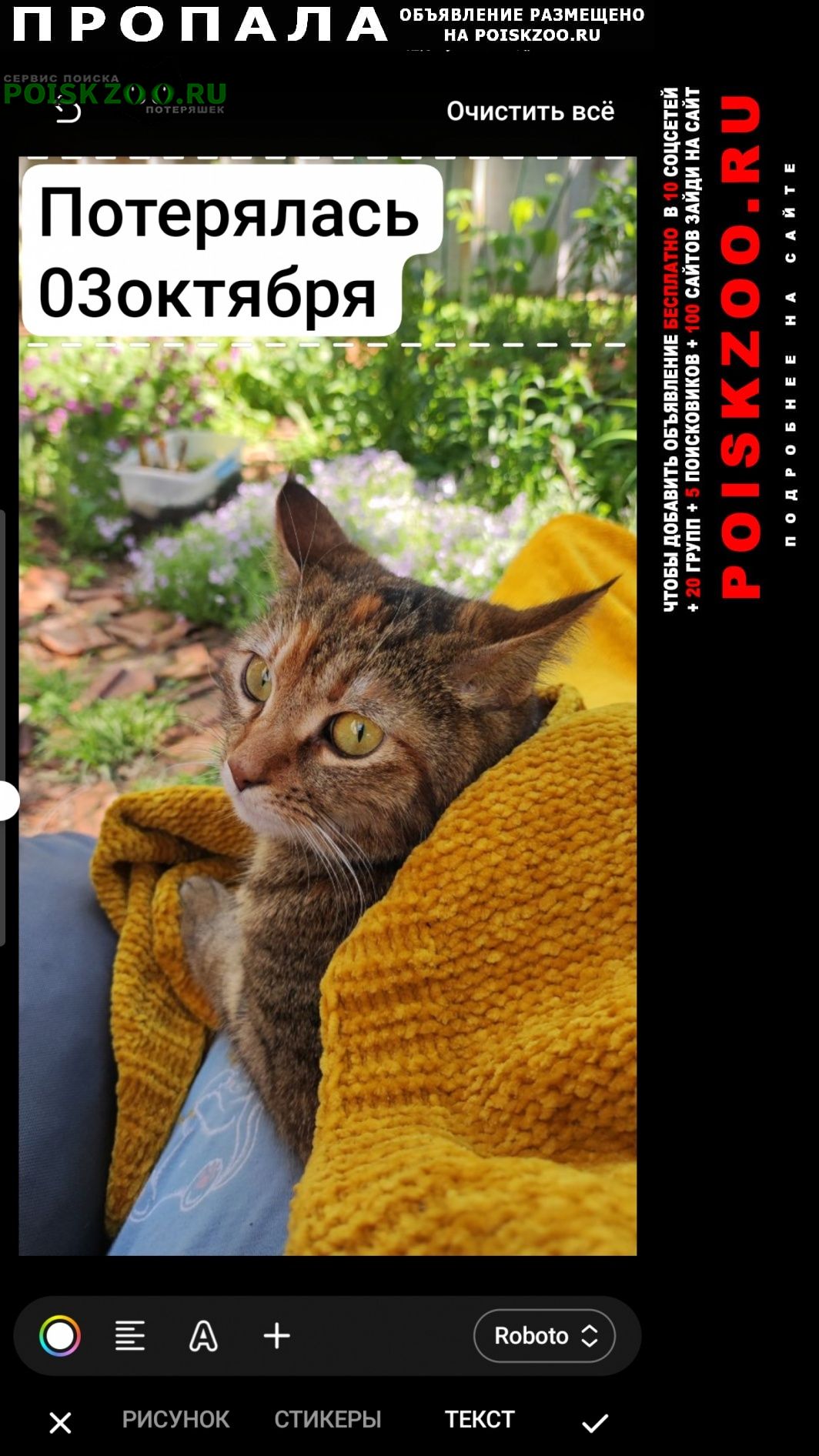 Объявление о том, что пропала кошка размещено в соцсетях:
