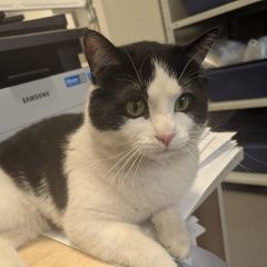 Котику чуть меньше года, крупный, пугливый, ласковый и кастрированный. Окрас чёрно-белый (спина, голова, хвост, уши черные, лапы, живот, грудь белые, морда чёрно-белая), нос розовый, глаза зелёные.