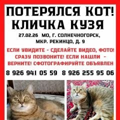 г. Солнечногорск мкр. Рекинцо ПРОПАЛ КОТ Поиски продолжаются, Кузя потерялся месяц назад. Приметы: метис с британским котом, глаза круглые желтоватые. Кастрирован. Окрас серо-коричневый, есть полоска. Мог похудеть и измениться. Пожалуйста если видели или нашли позвоните