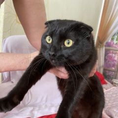 Найден молодой кот, породы Шотландская вислоухая, не кастрирован, чисто черный с золотистыми глазами, короткошерстный. Верну за вознаграждение.